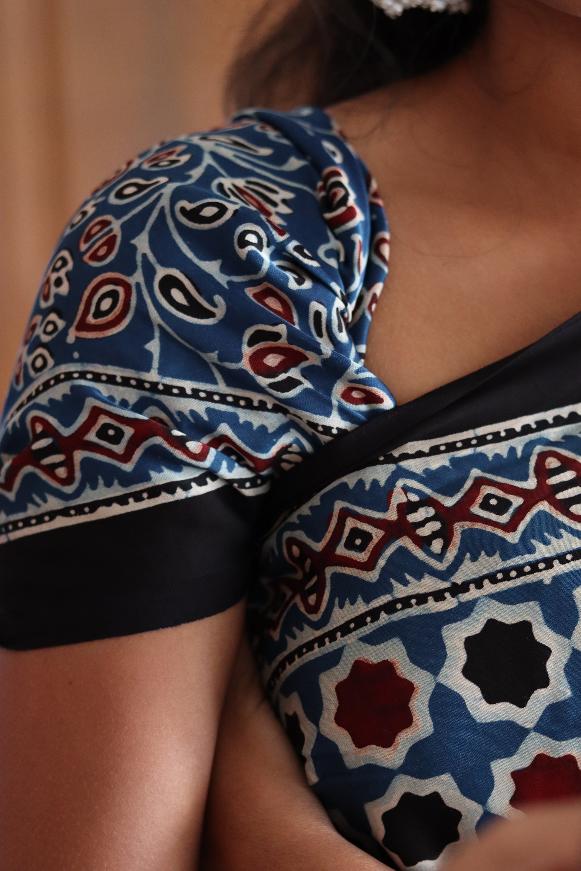 Indulge in the mesmerizing beauty of our Ajrakh Modal Silk saree, where centuries-old craftsmanship meets modern elegance.This ensemble comes complete with a matching blouse, intricately designed to complement the saree's beauty.