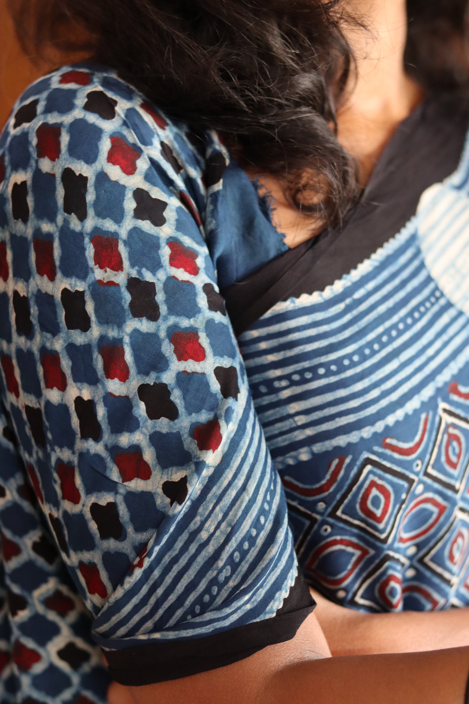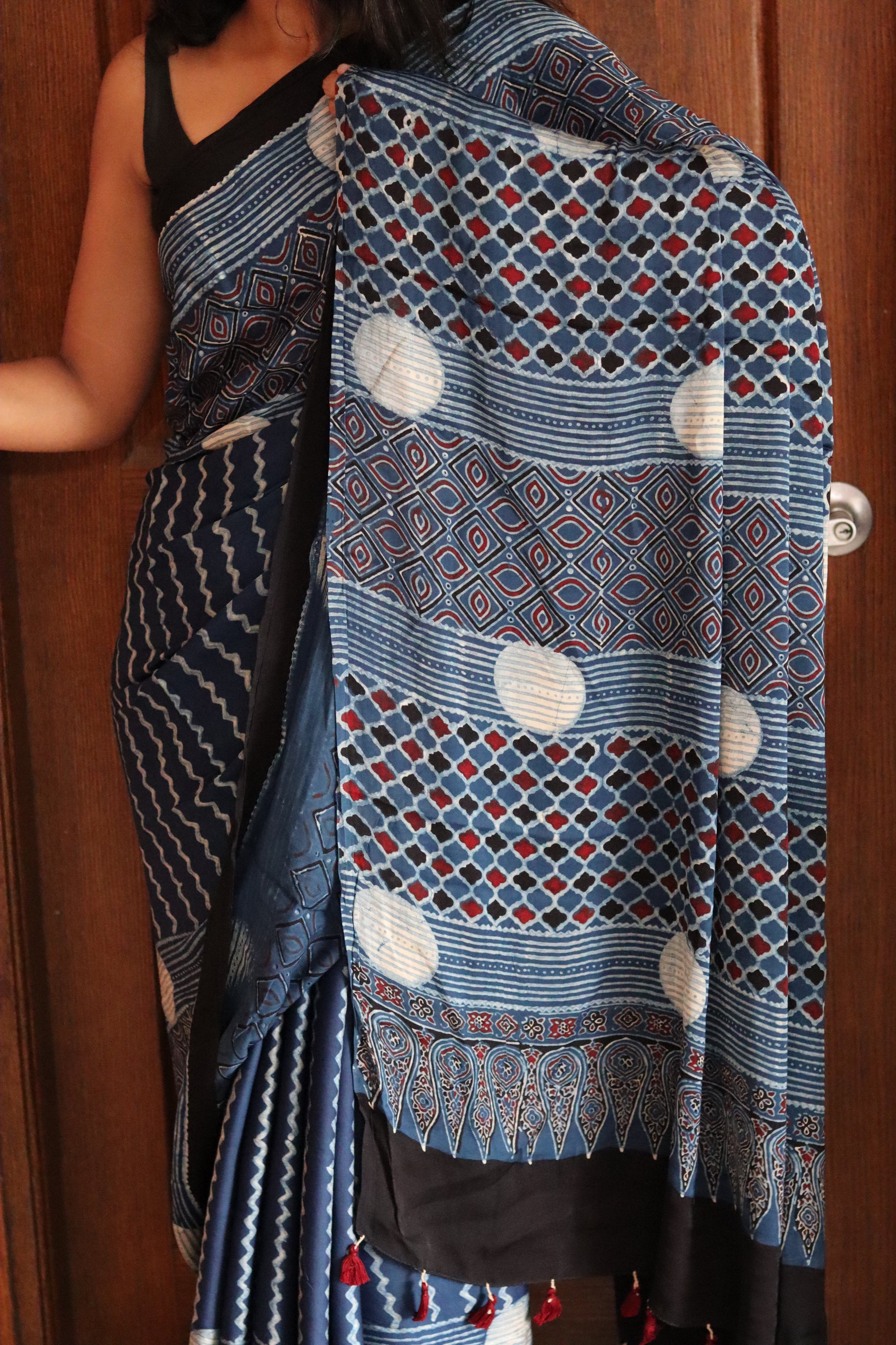 Indulge in the mesmerizing beauty of our Ajrakh Modal Silk saree, where centuries-old craftsmanship meets modern elegance.This ensemble comes complete with a matching blouse, intricately designed to complement the saree's beauty.