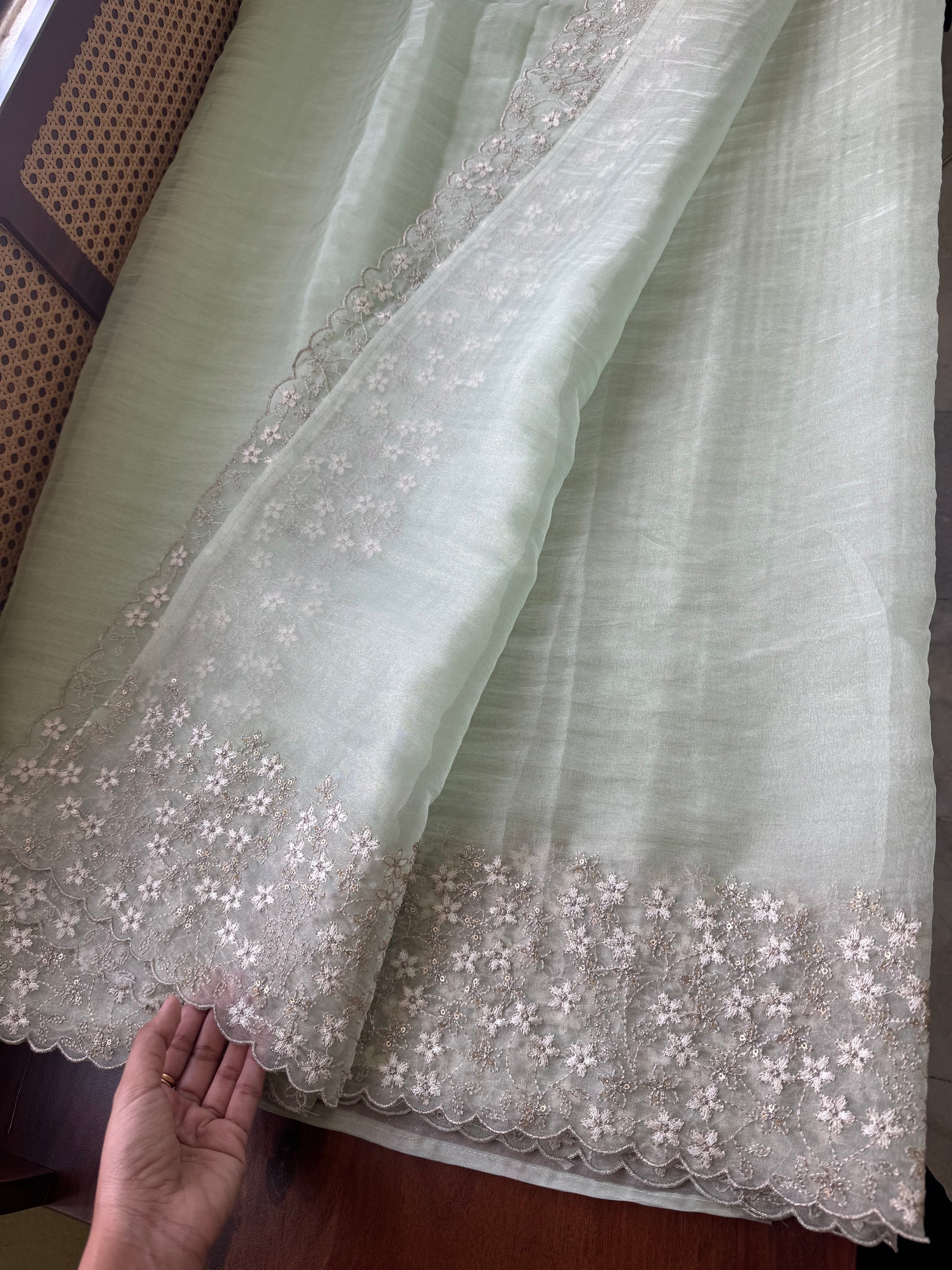 • Paired with a running blouse that features a embroidered border pattern, adding a grand and luxurious finish