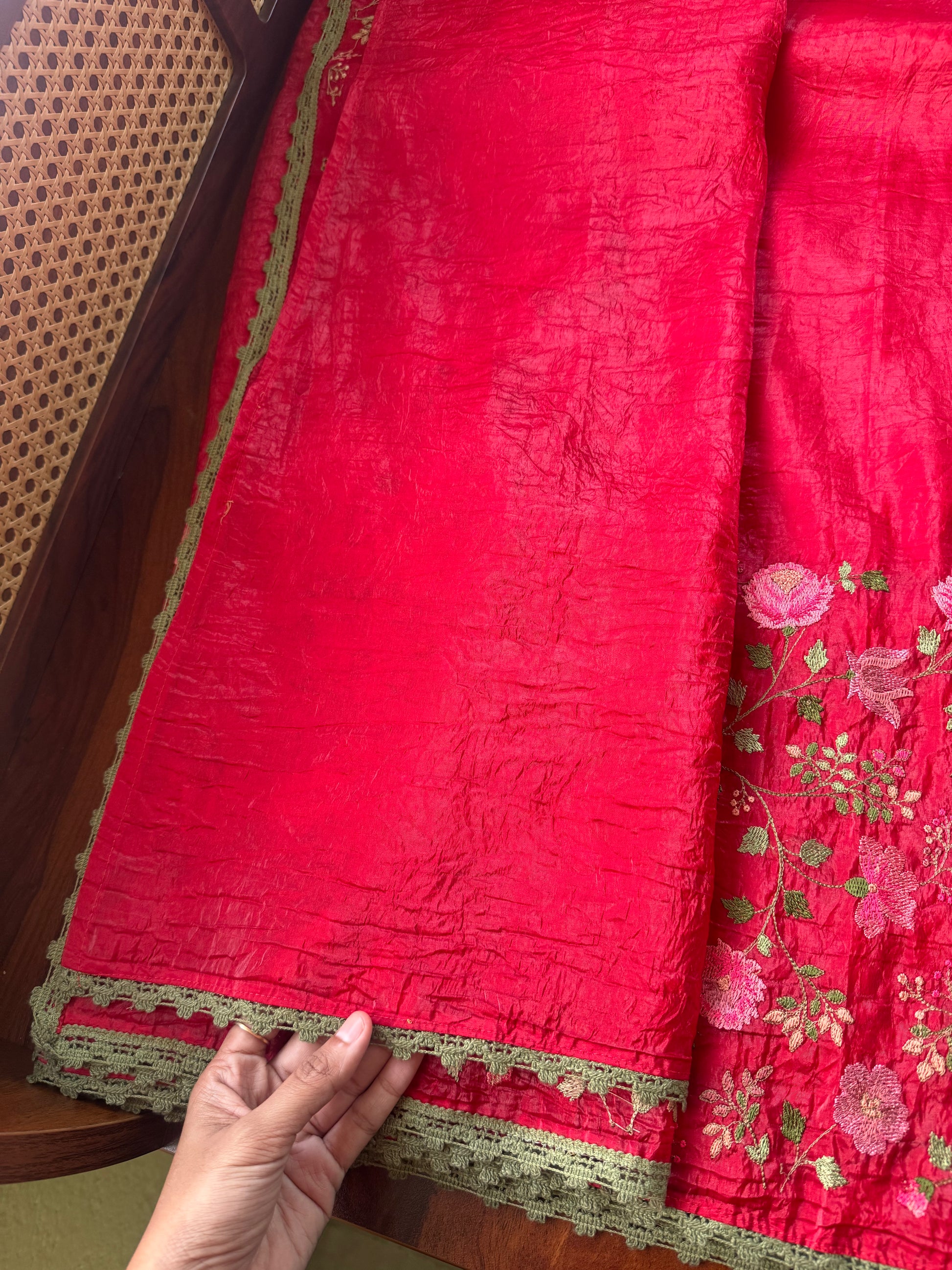 Embroidered Crush Satin Georgette Saree - Cherry Red