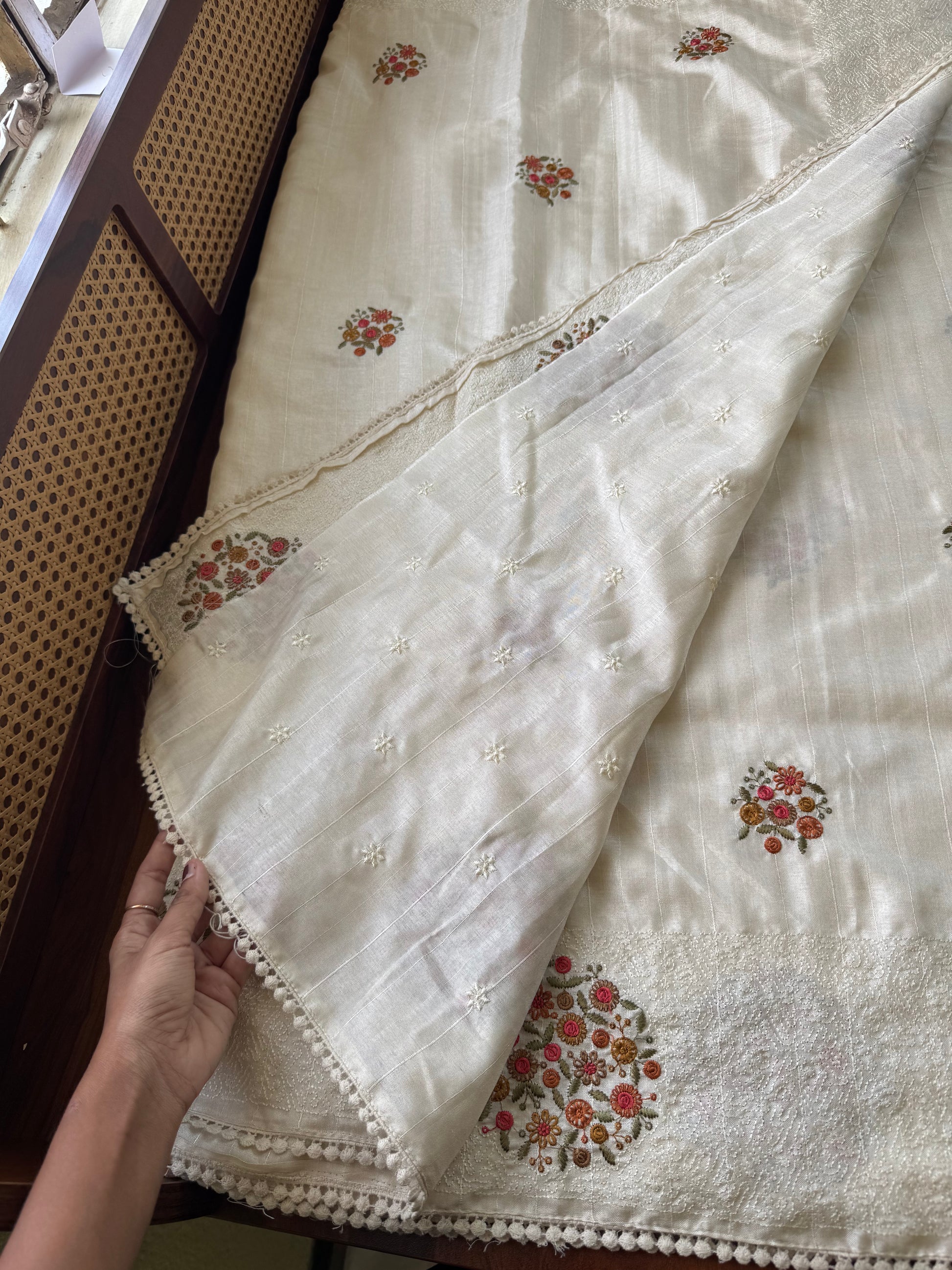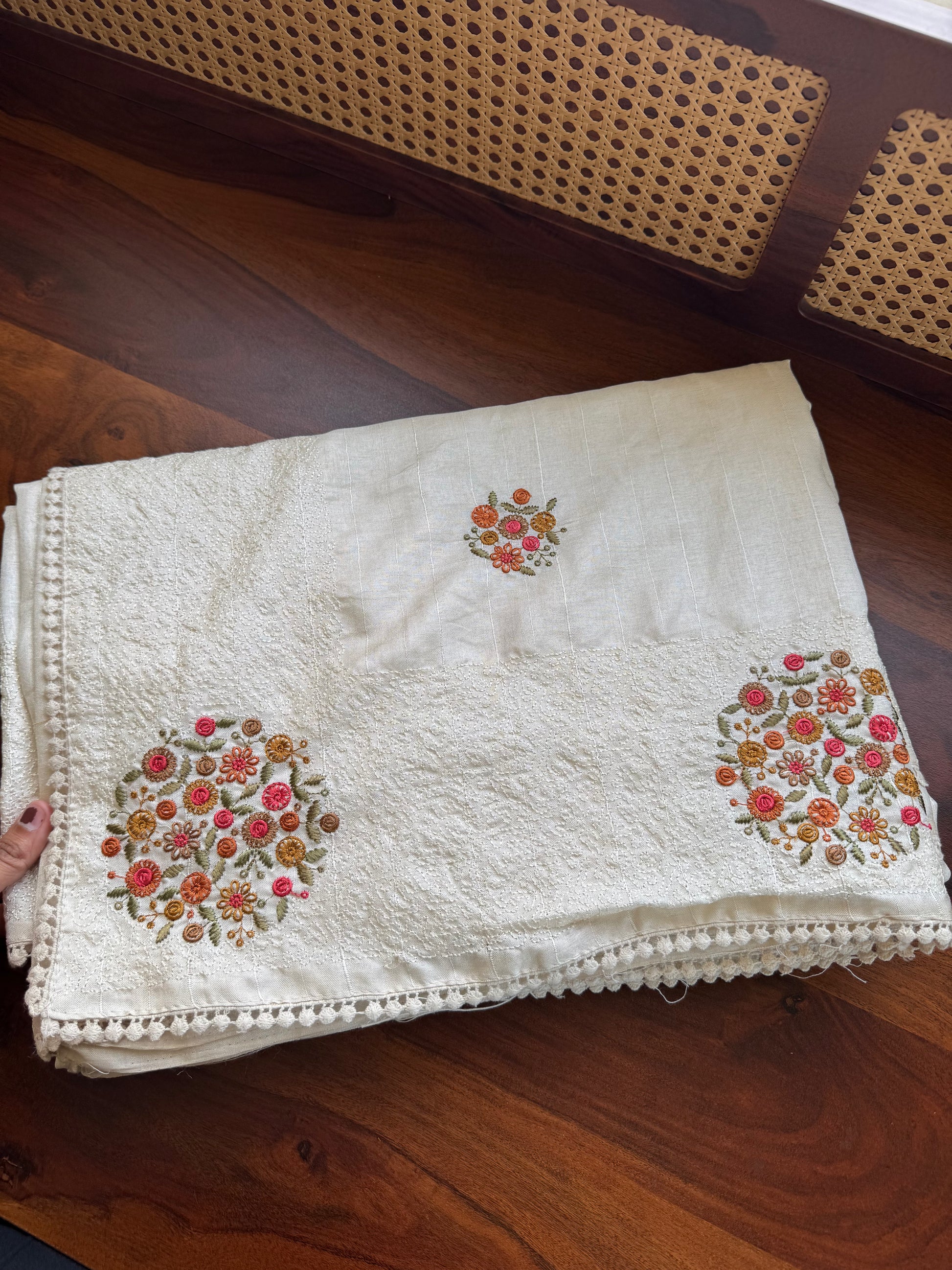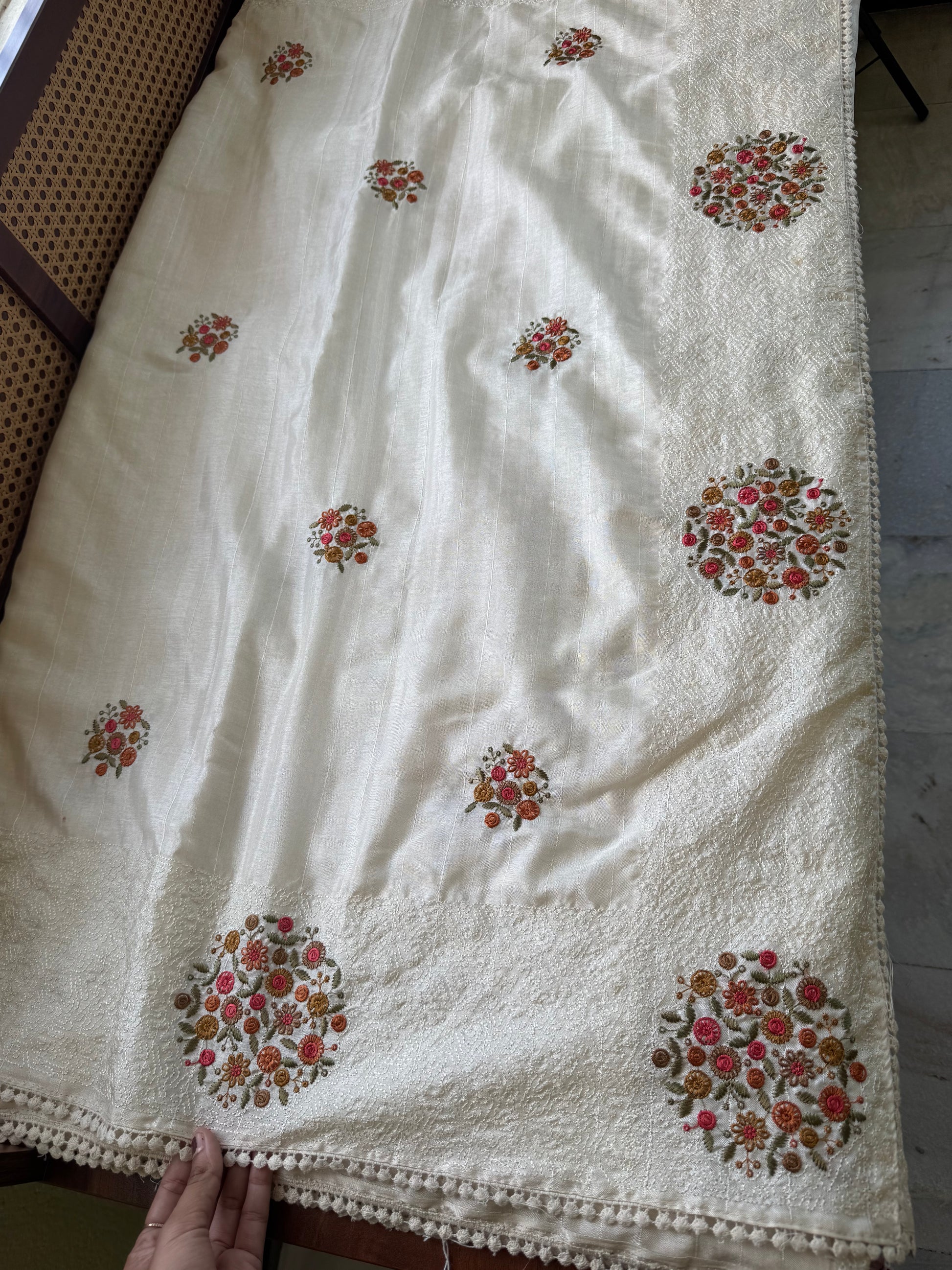 • Saree body is adorned with scattered floral embroidery work