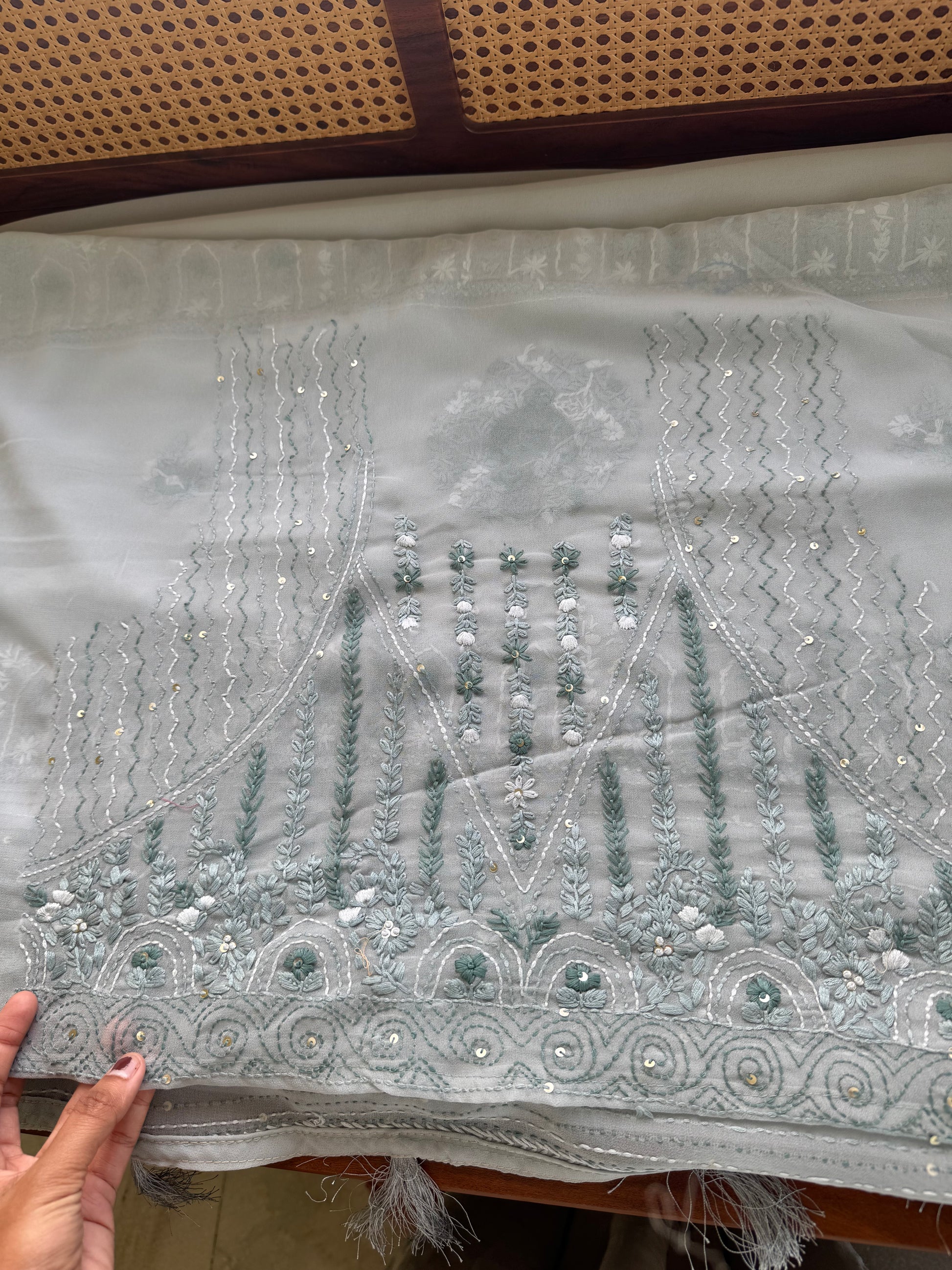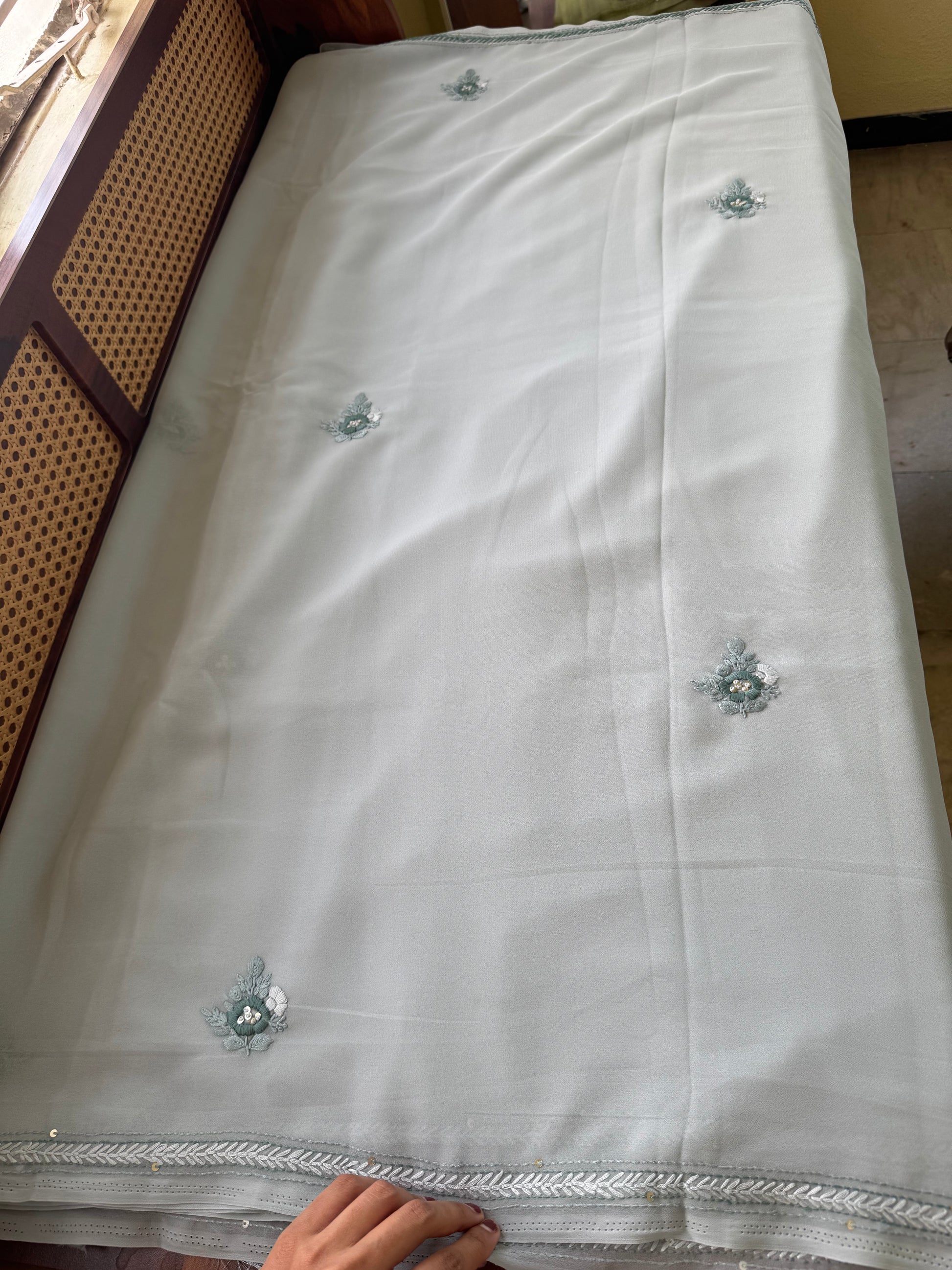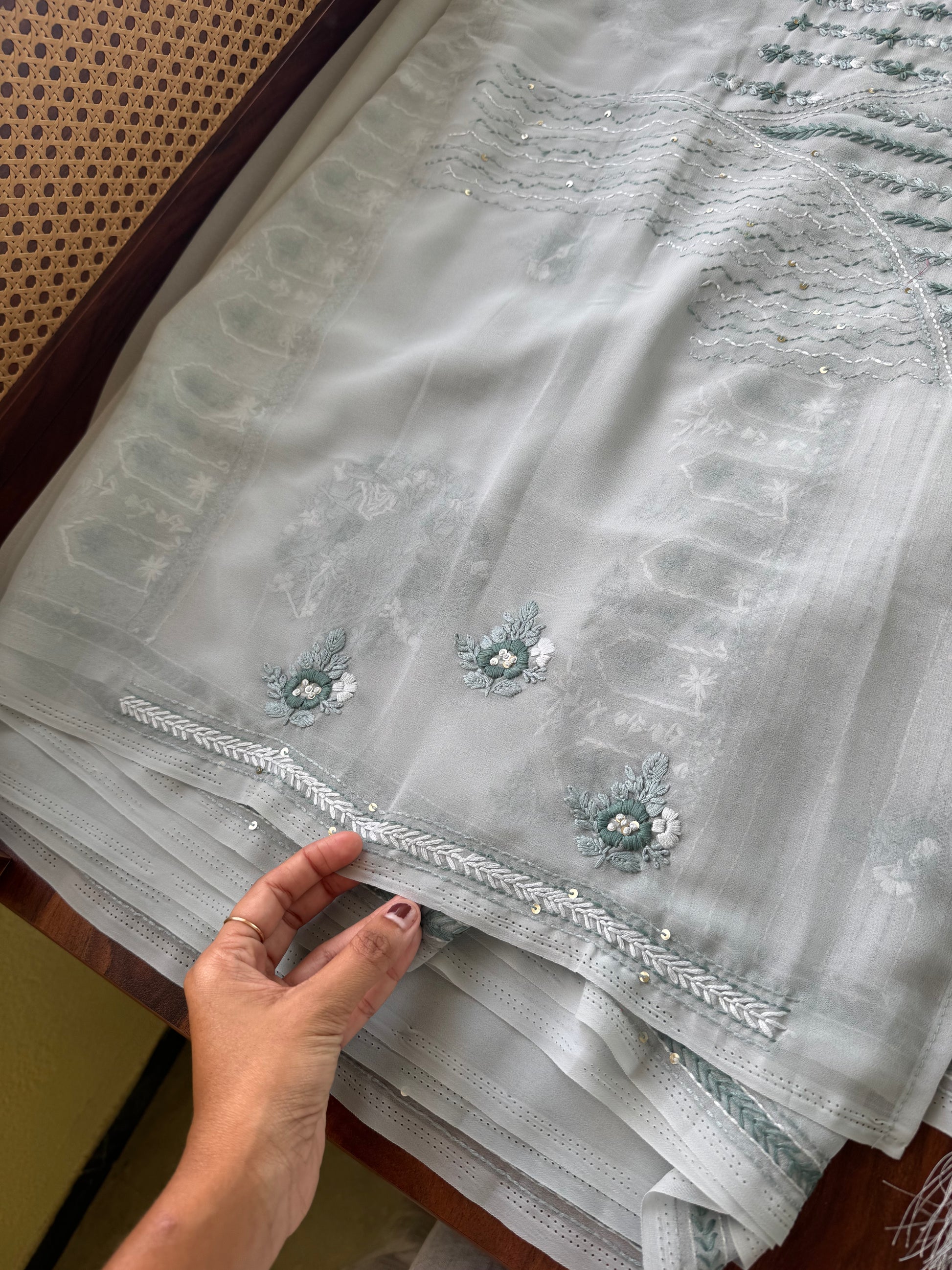 • Features a statement pallu, hand-embroidered with intricate French knots for a touch of artistry