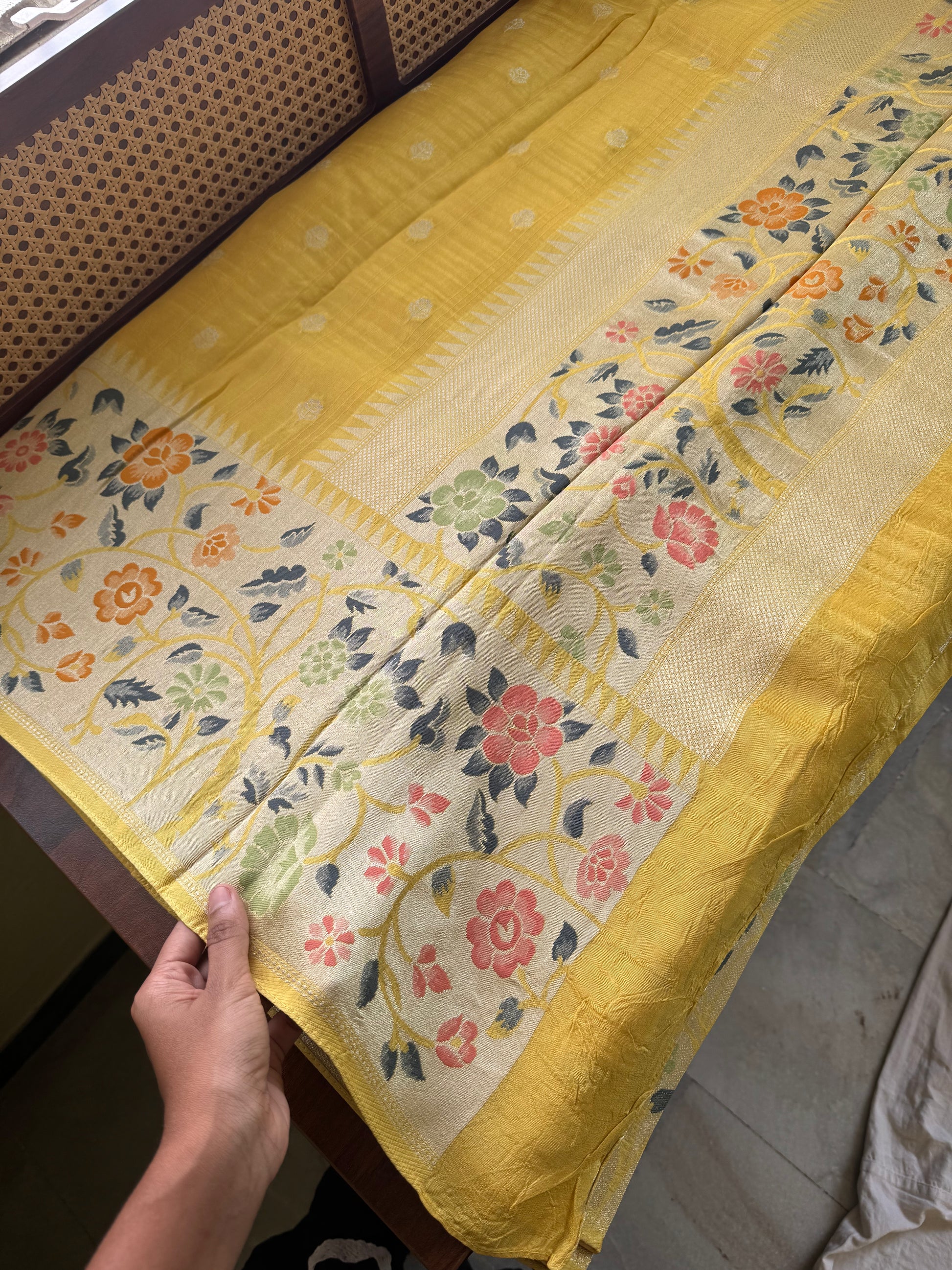 • Crafted from premium soft tussar georgette semi silk with meenakari border