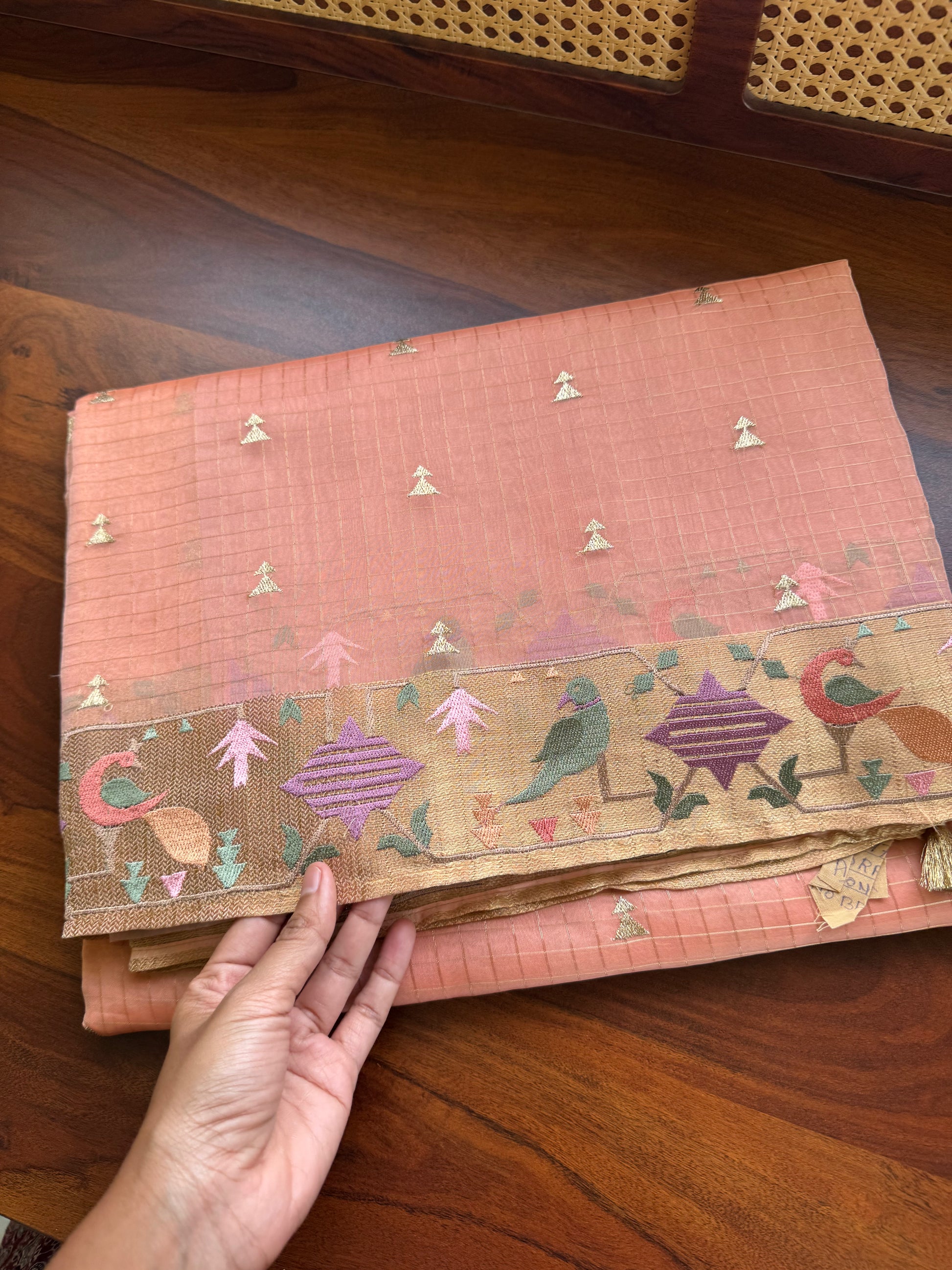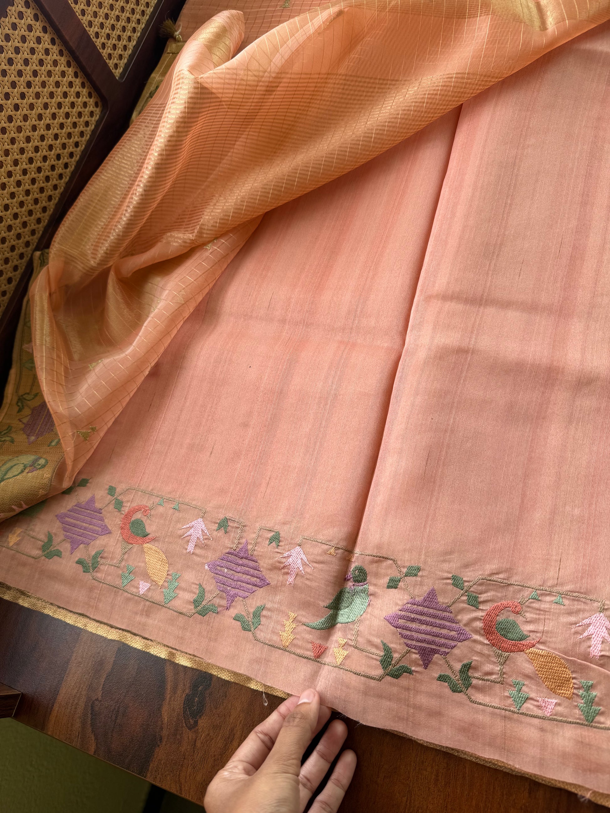 • Paired with a running blouse in tussar blend with embroidery detailing for the sleeves.