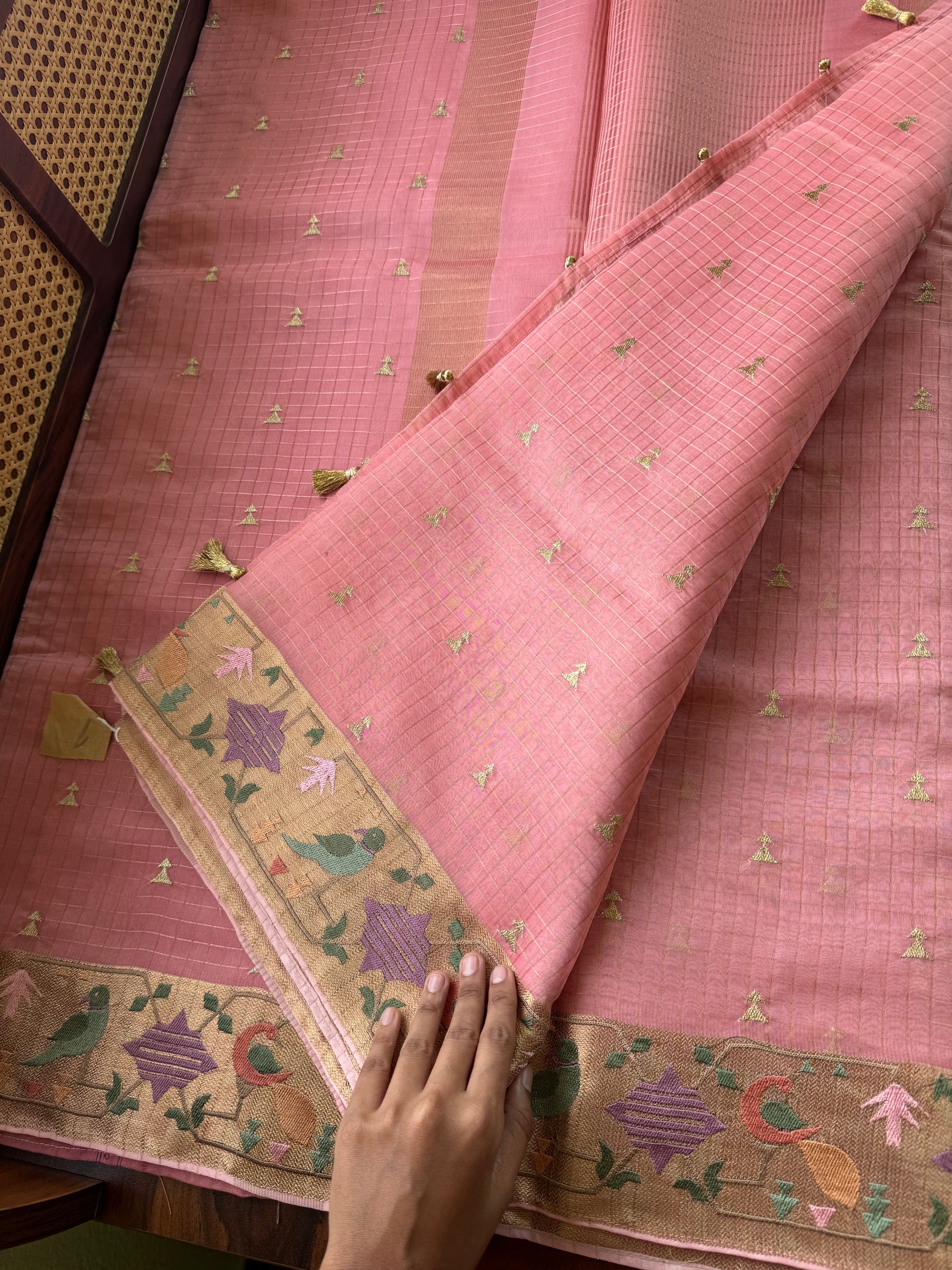 • Paired with a running blouse in tussar blend with embroidery detailing for the sleeves.