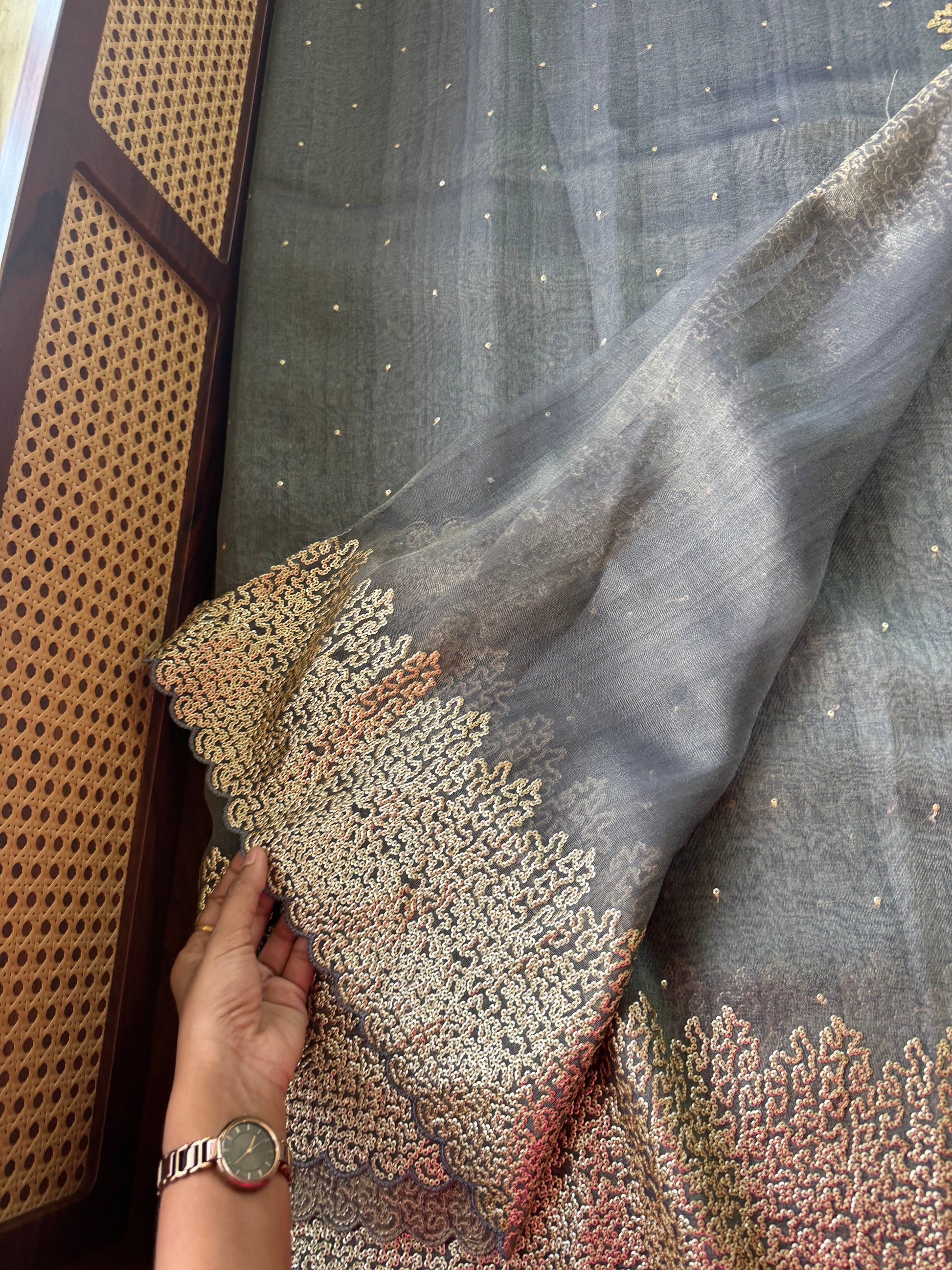 • Features a statement pallu, embroidered with sequin for a touch of artistry