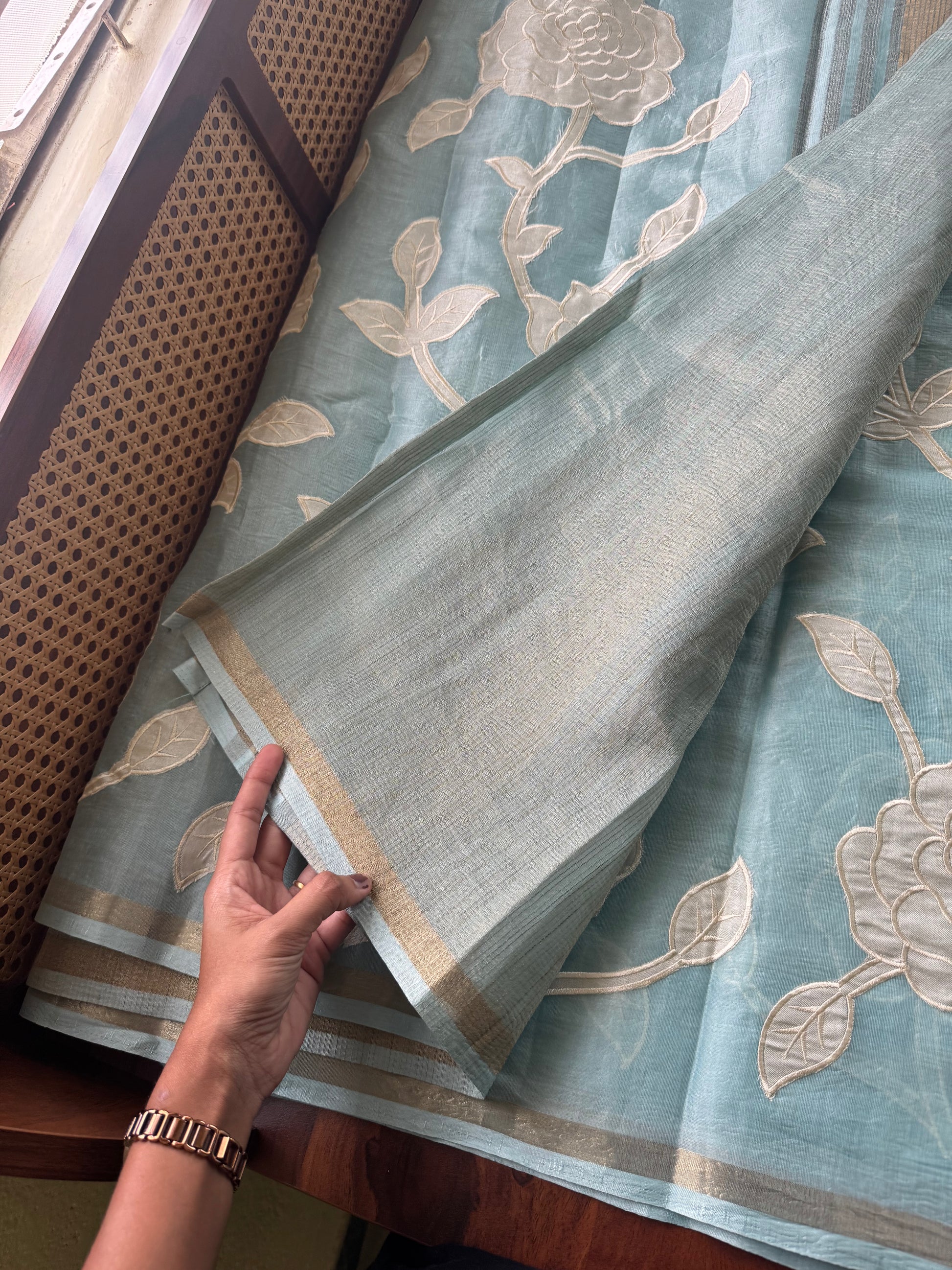 Mul Chanderi Tissue Saree with appliqué - Blue