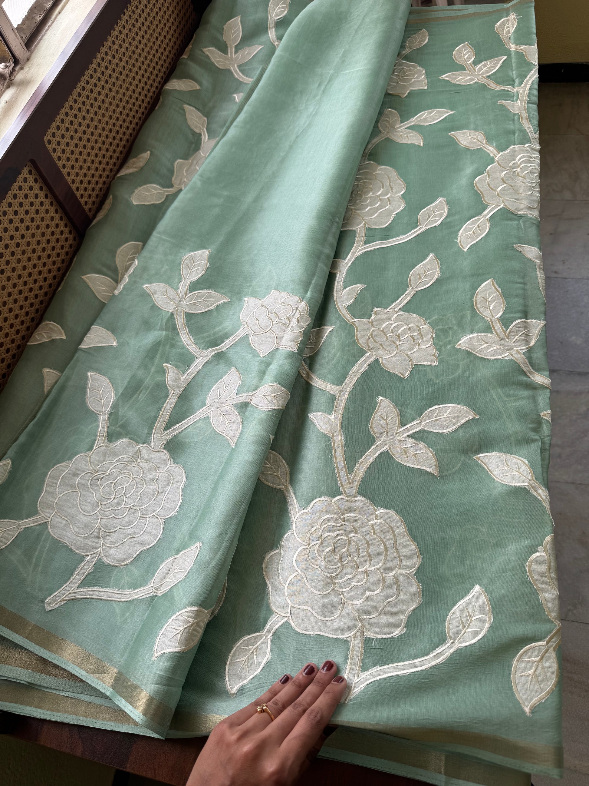 • Design: Delicately appliqué embroidered motifs spread across the body of the saree