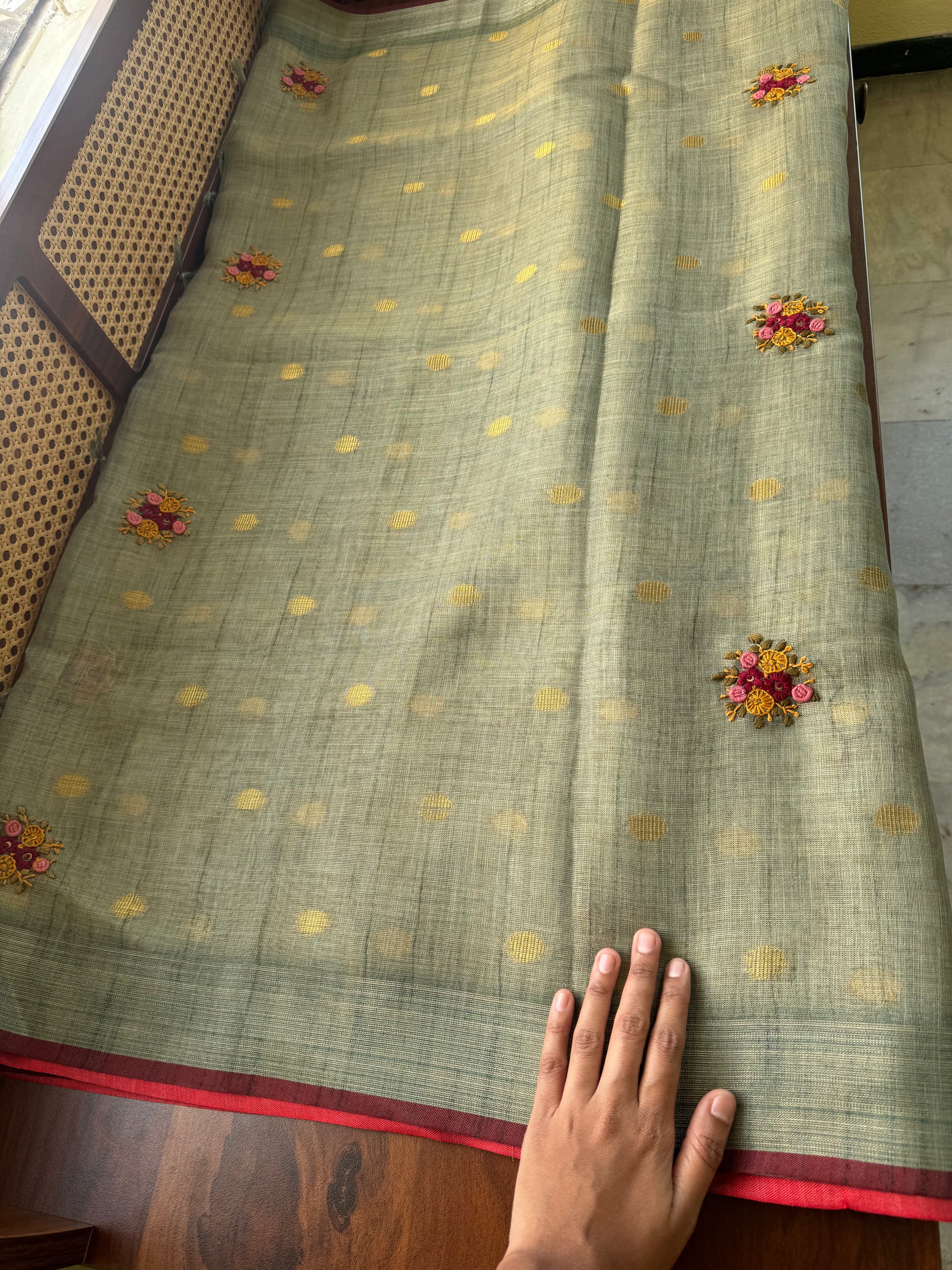 • Features a statement pallu, hand-embroidered with intricate French knots for a touch of artistry