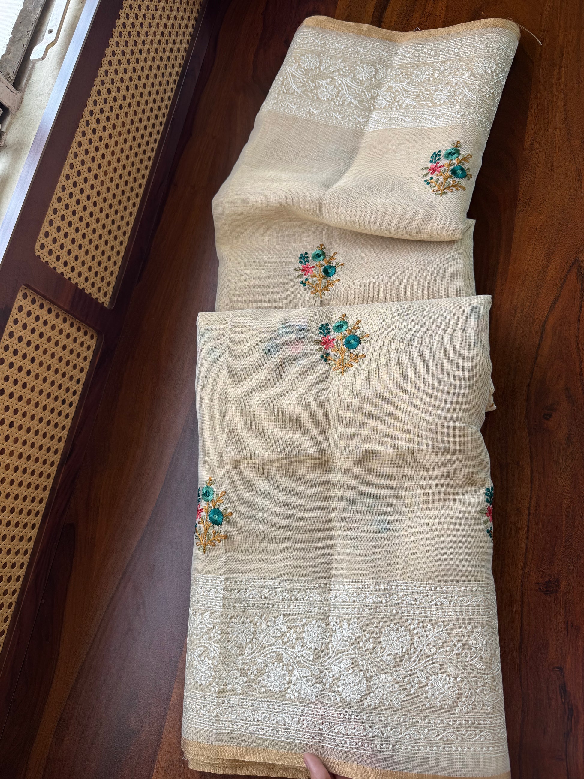 Premium Tissue Linen Sarees - Half White & Peacock Blue