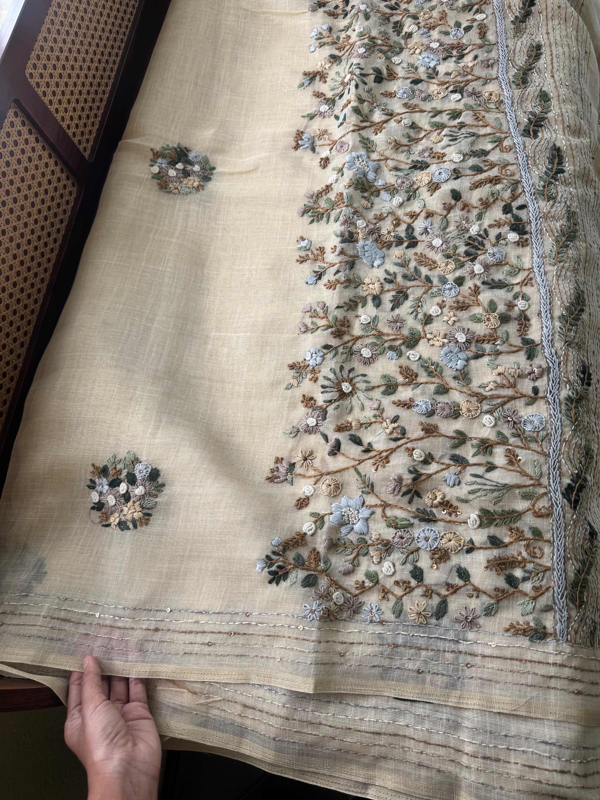 • Features a statement pallu, hand-embroidered with intricate French knots for a touch of artistry