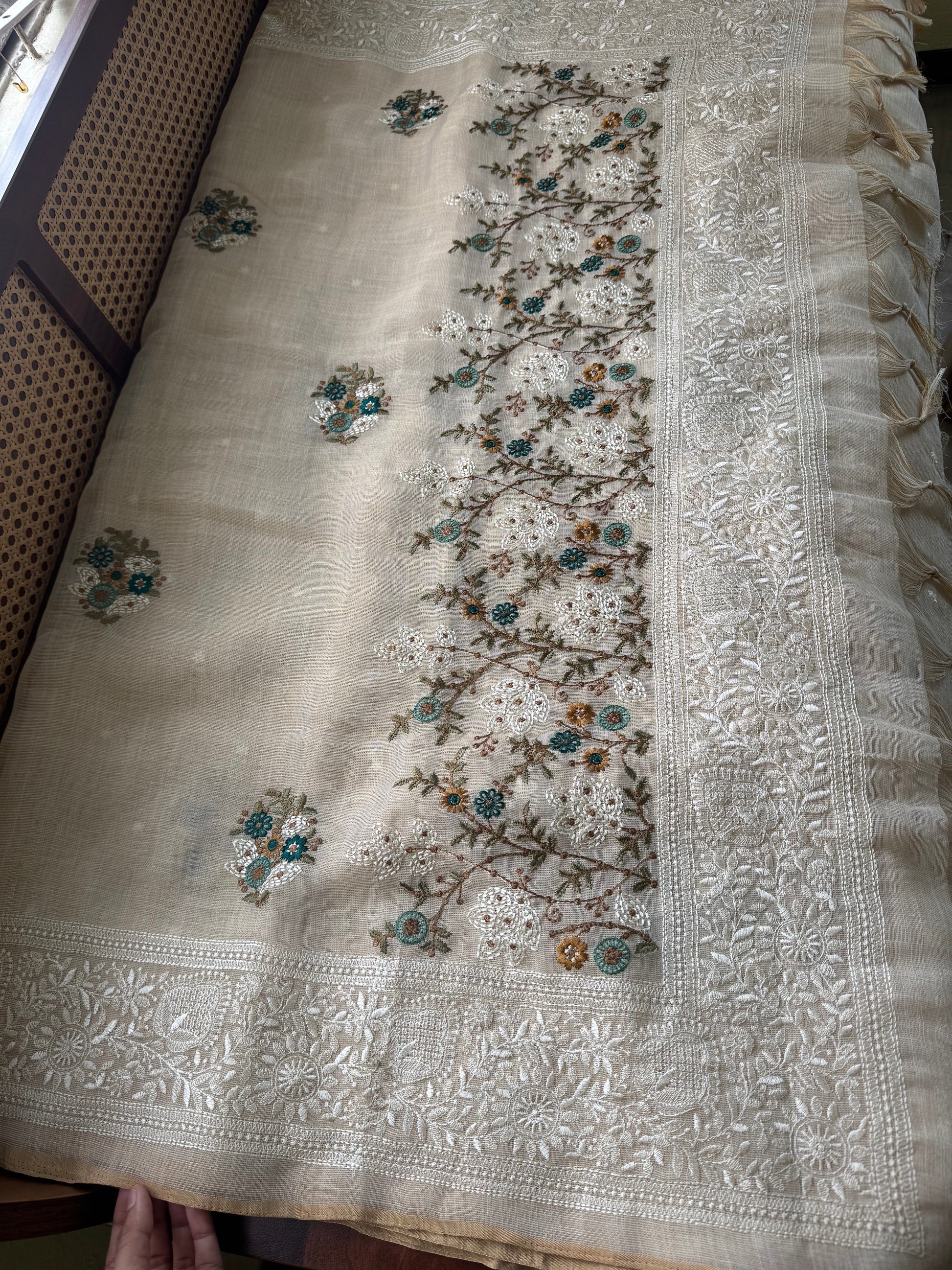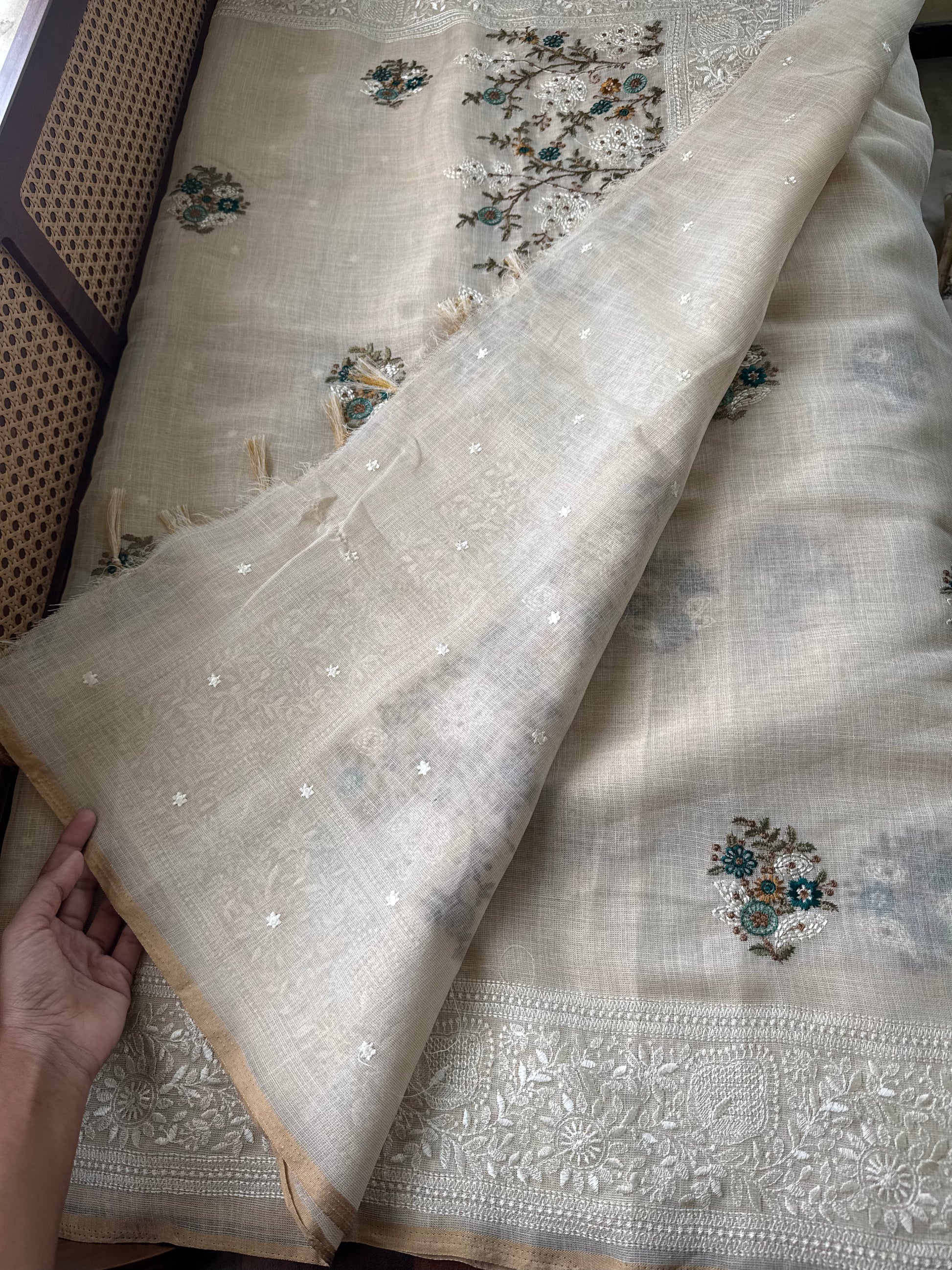Premium Tissue Linen Sarees - Half White & Peacock Blue