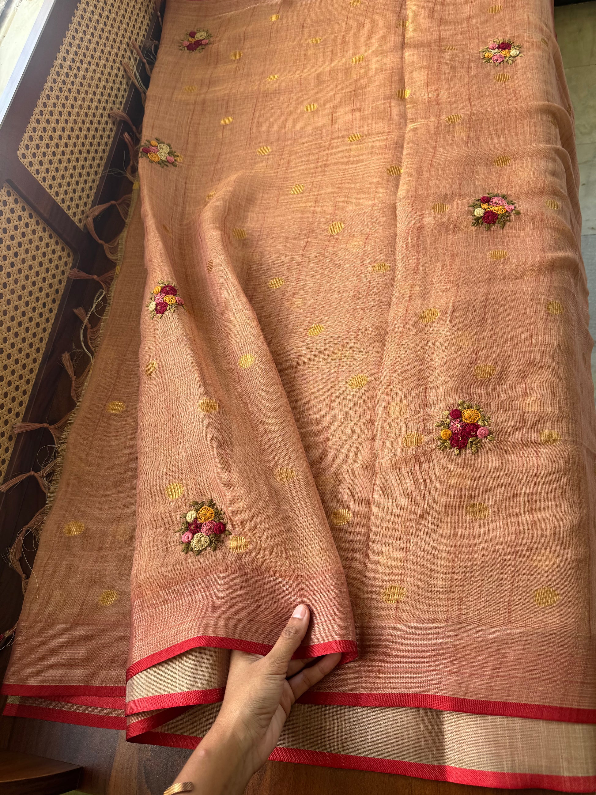 • Features a statement pallu, hand-embroidered with intricate French knots for a touch of artistry