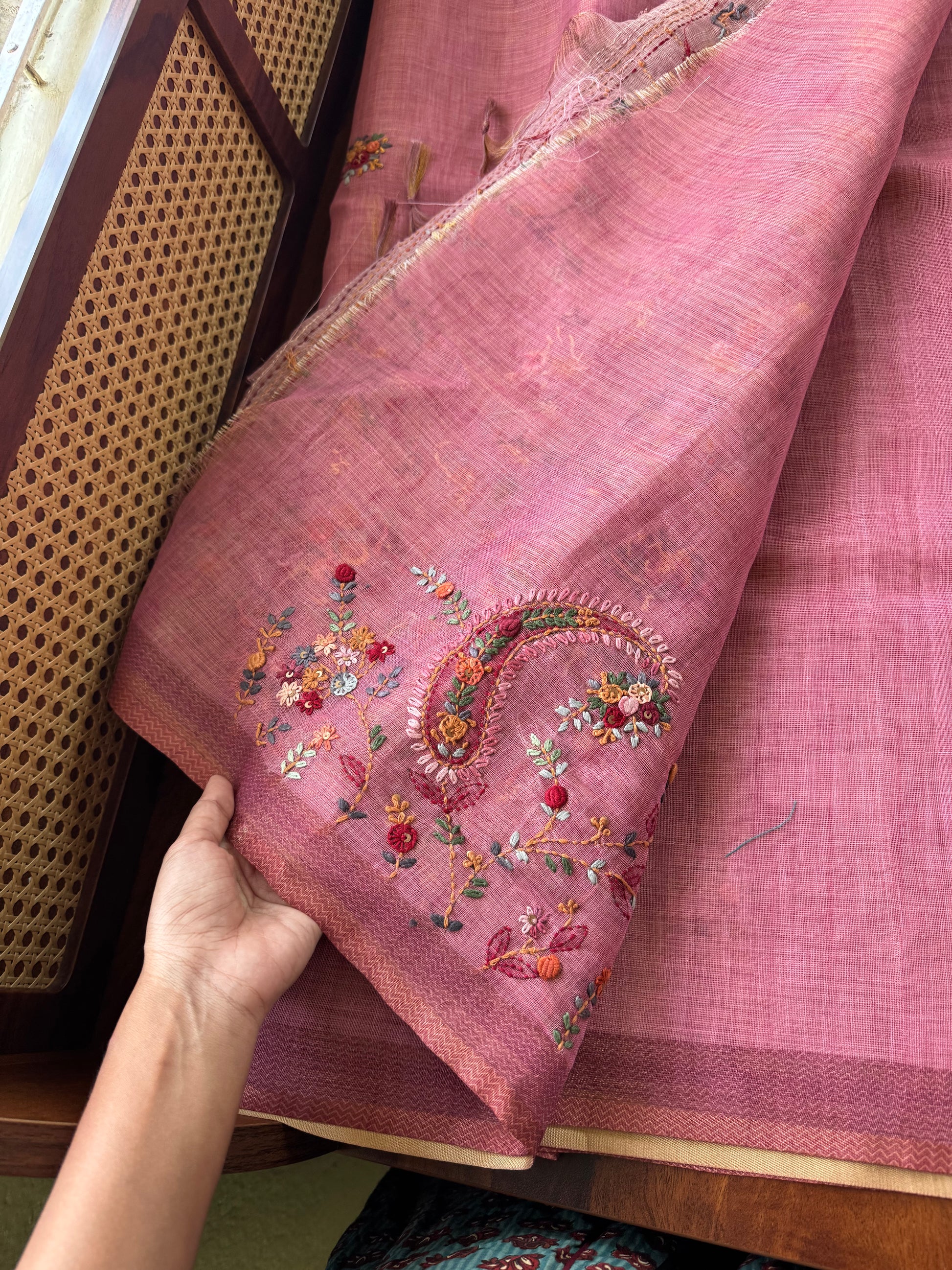• Features a statement pallu, hand-embroidered with intricate French knots for a touch of artistry