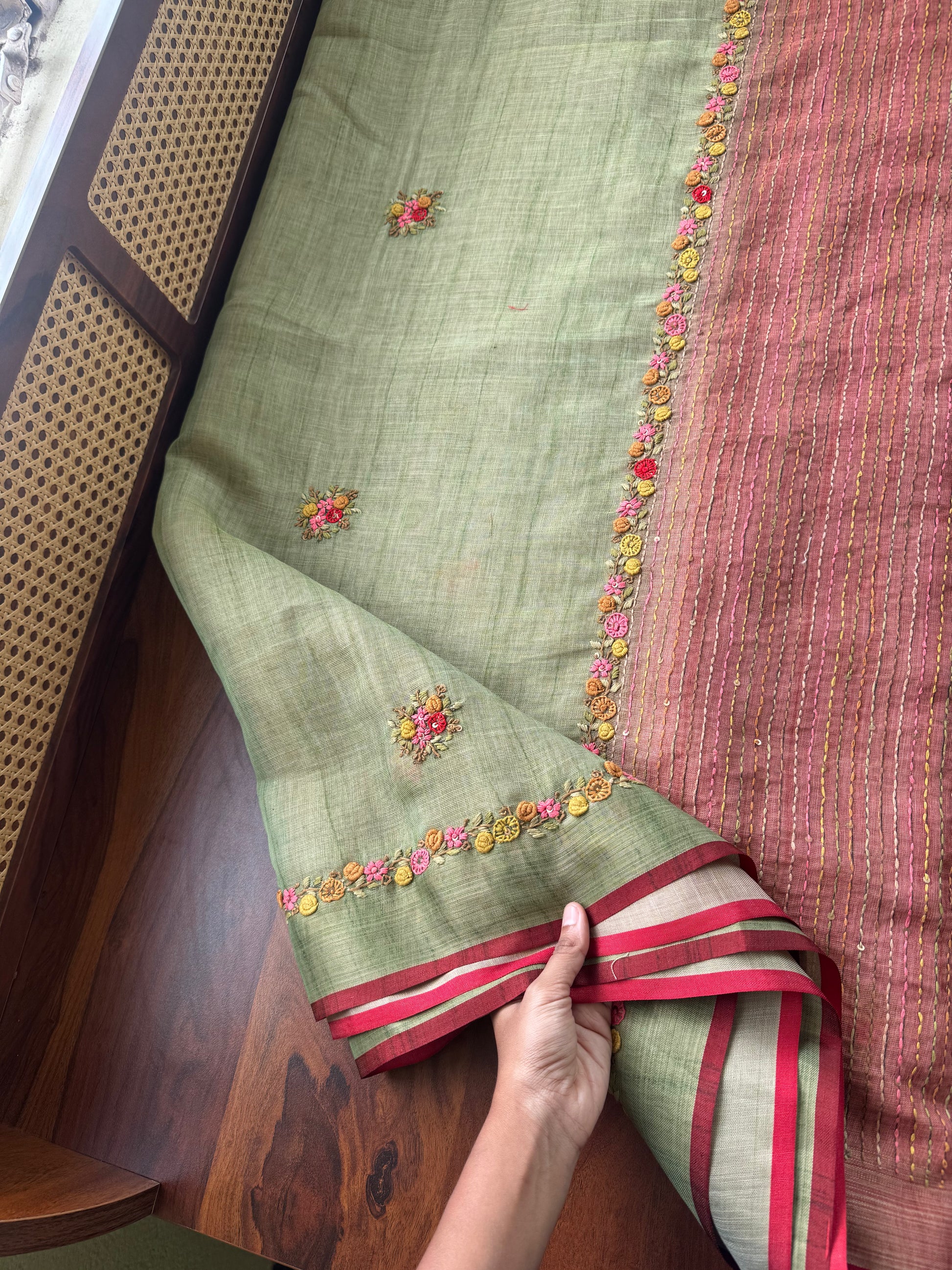 • Features a statement pallu, hand-embroidered with intricate French knots for a touch of artistry