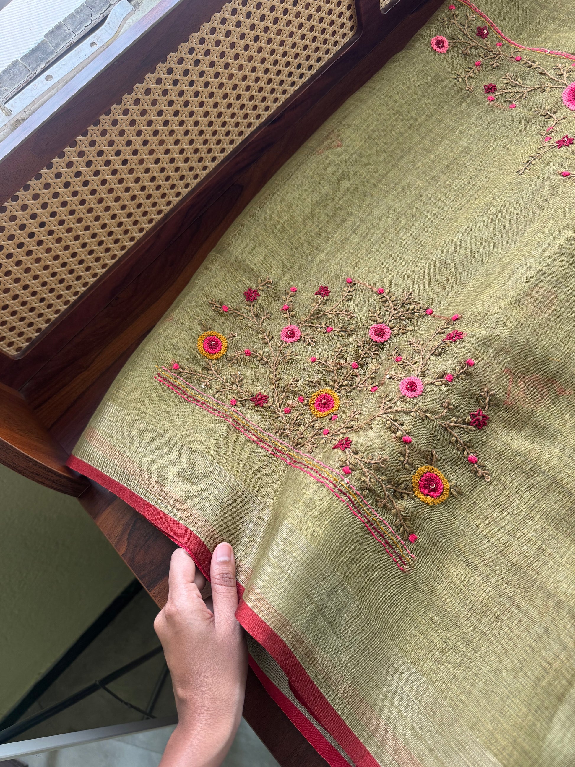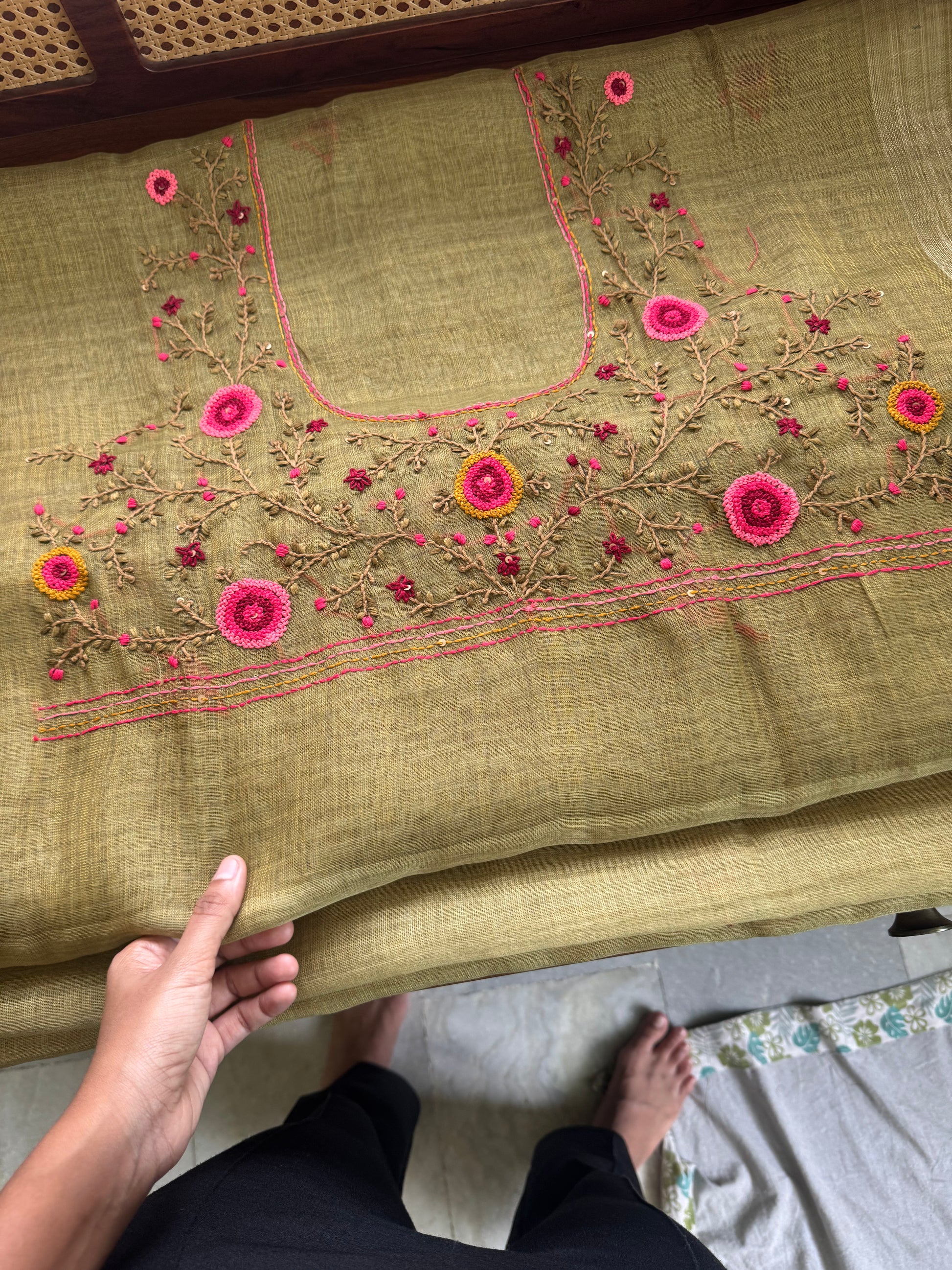 • Features a statement pallu, hand-embroidered with intricate French knots for a touch of artistry