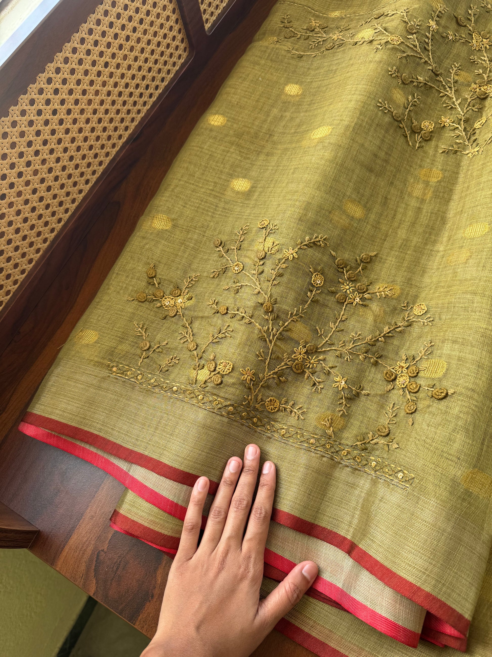 • Features a statement pallu, hand-embroidered with intricate French knots for a touch of artistry