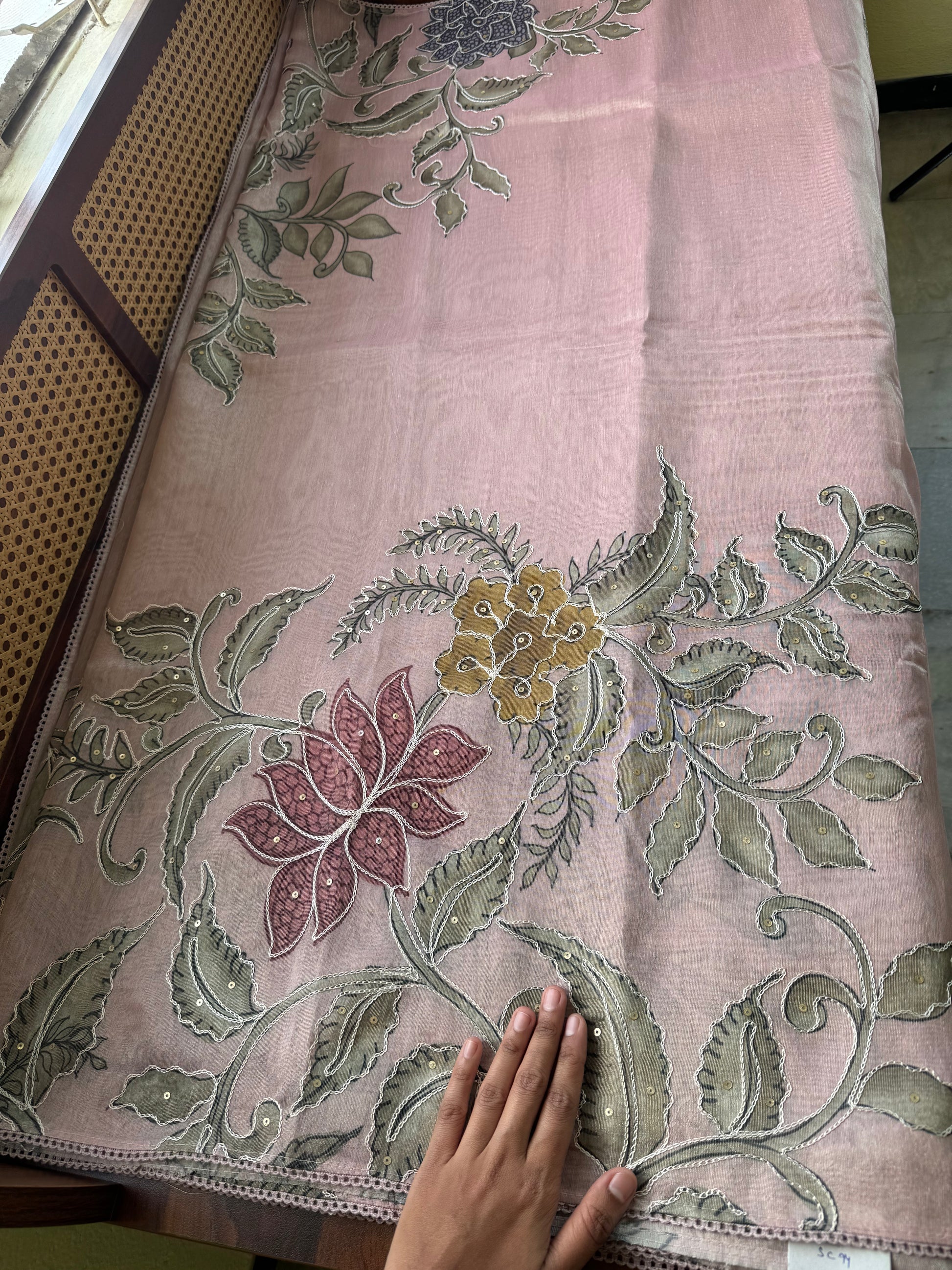 • Fabric: Premium zari tissue — sheer and luxurious