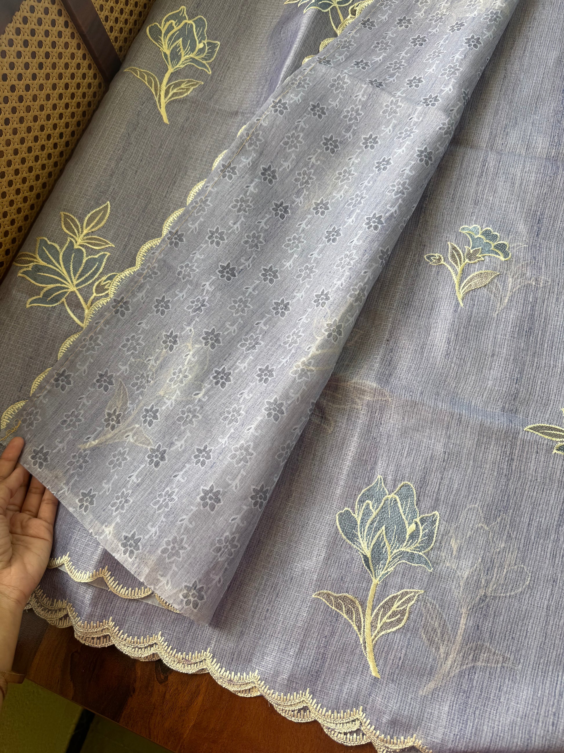 • Saree body is adorned with scattered and embroidered motiffs