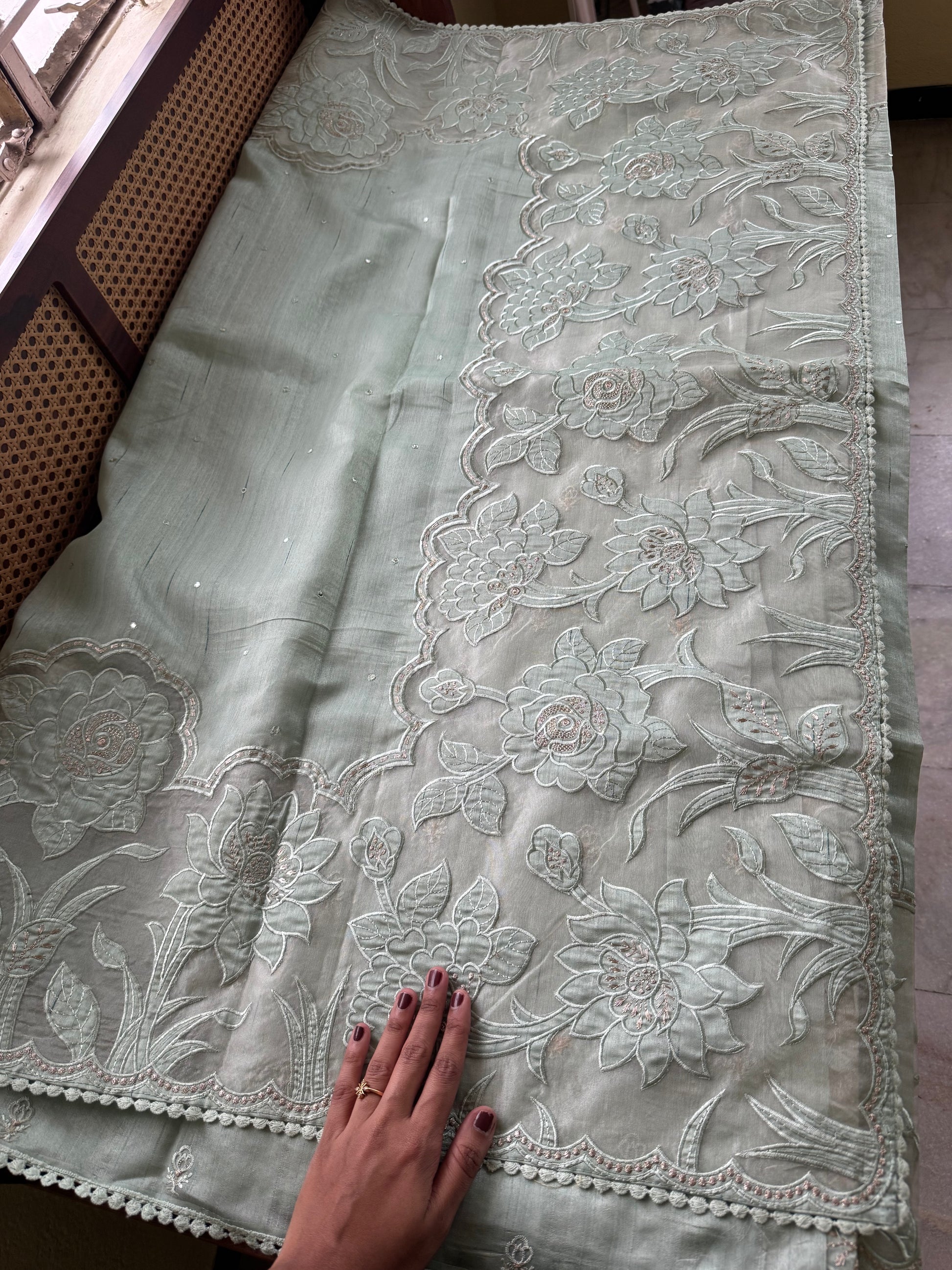 • Work: Elegant embroidery with intricate applique detailing all over
