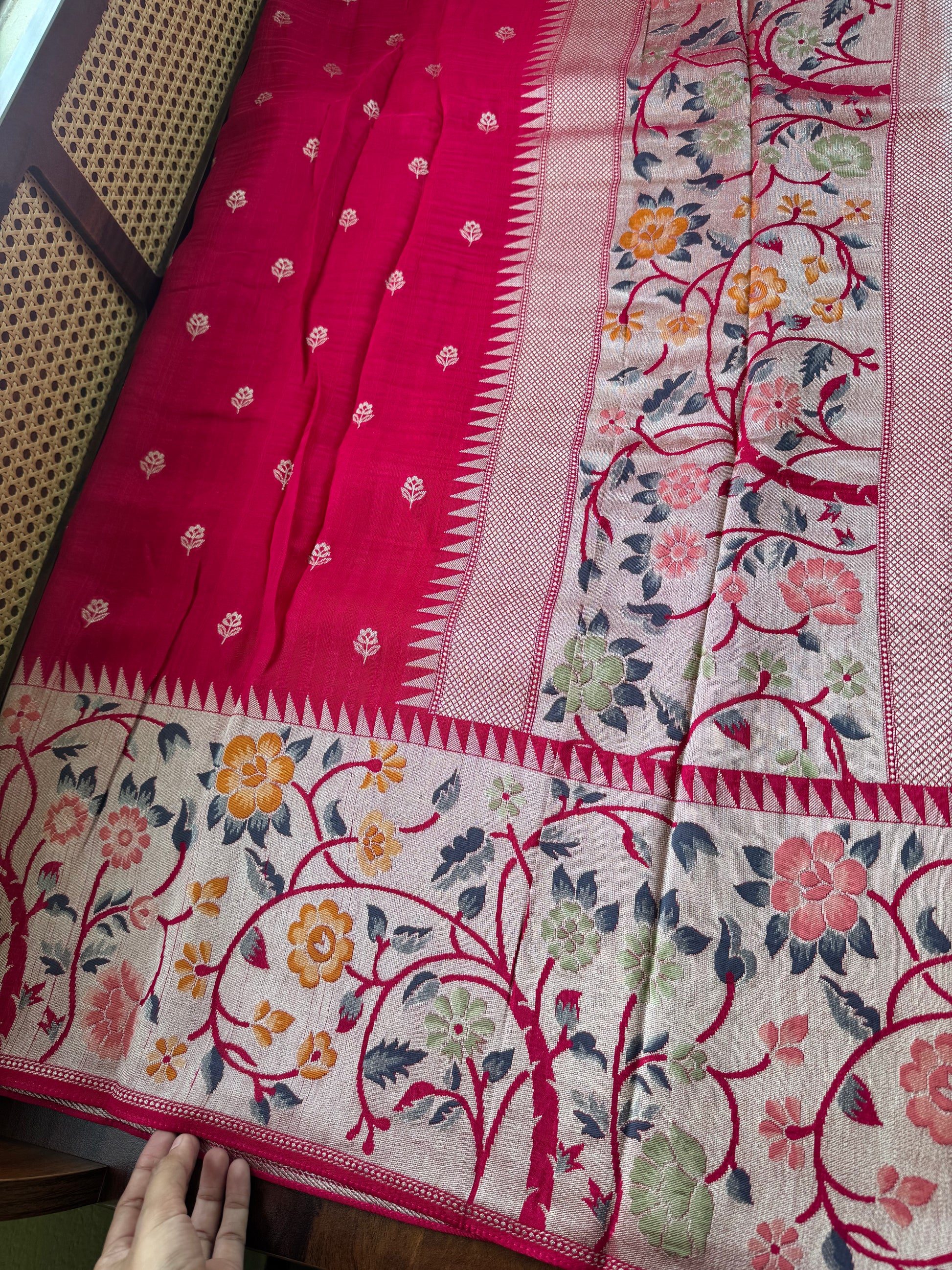 • Crafted from premium soft tussar georgette semi silk with meenakari border