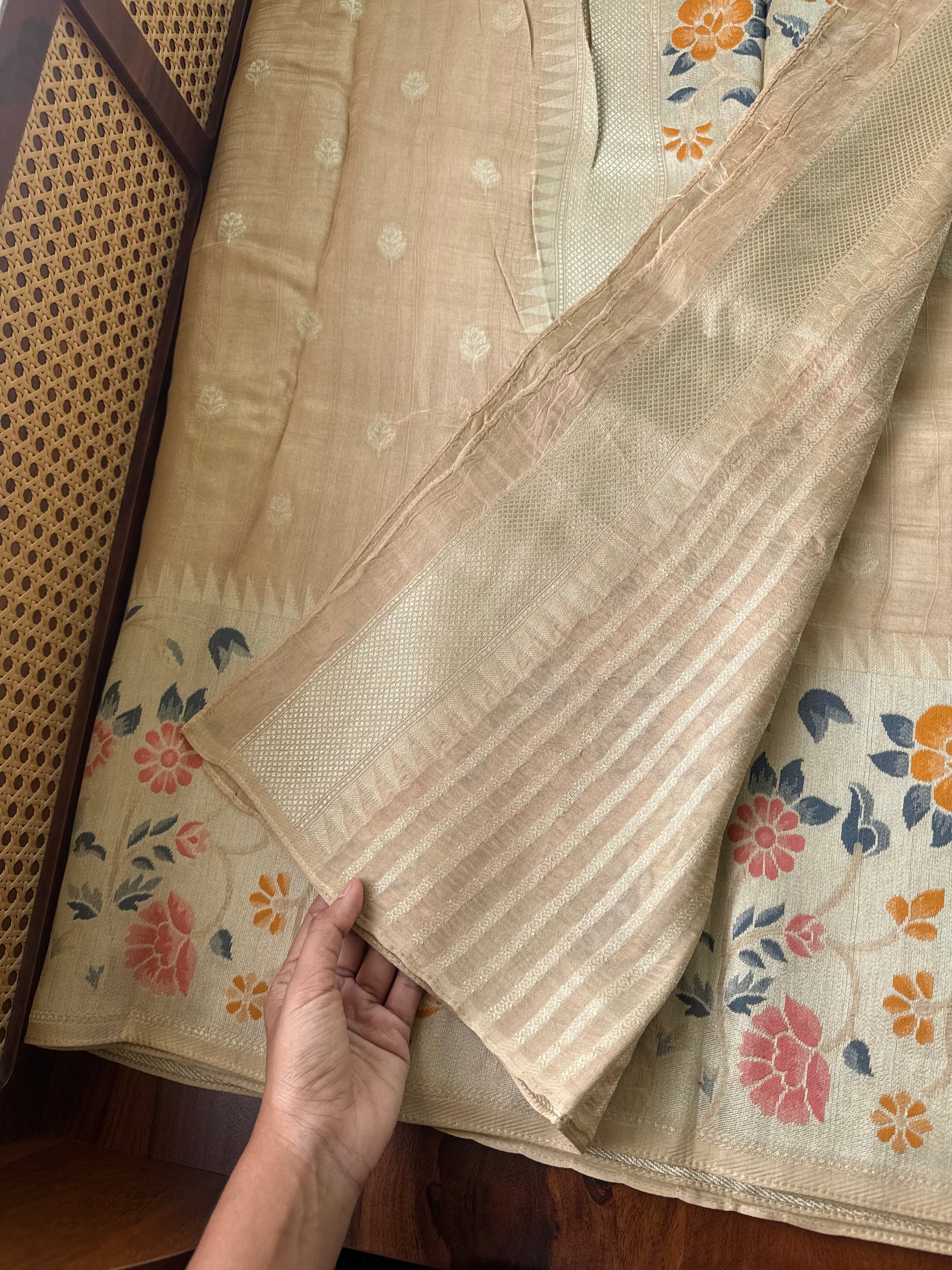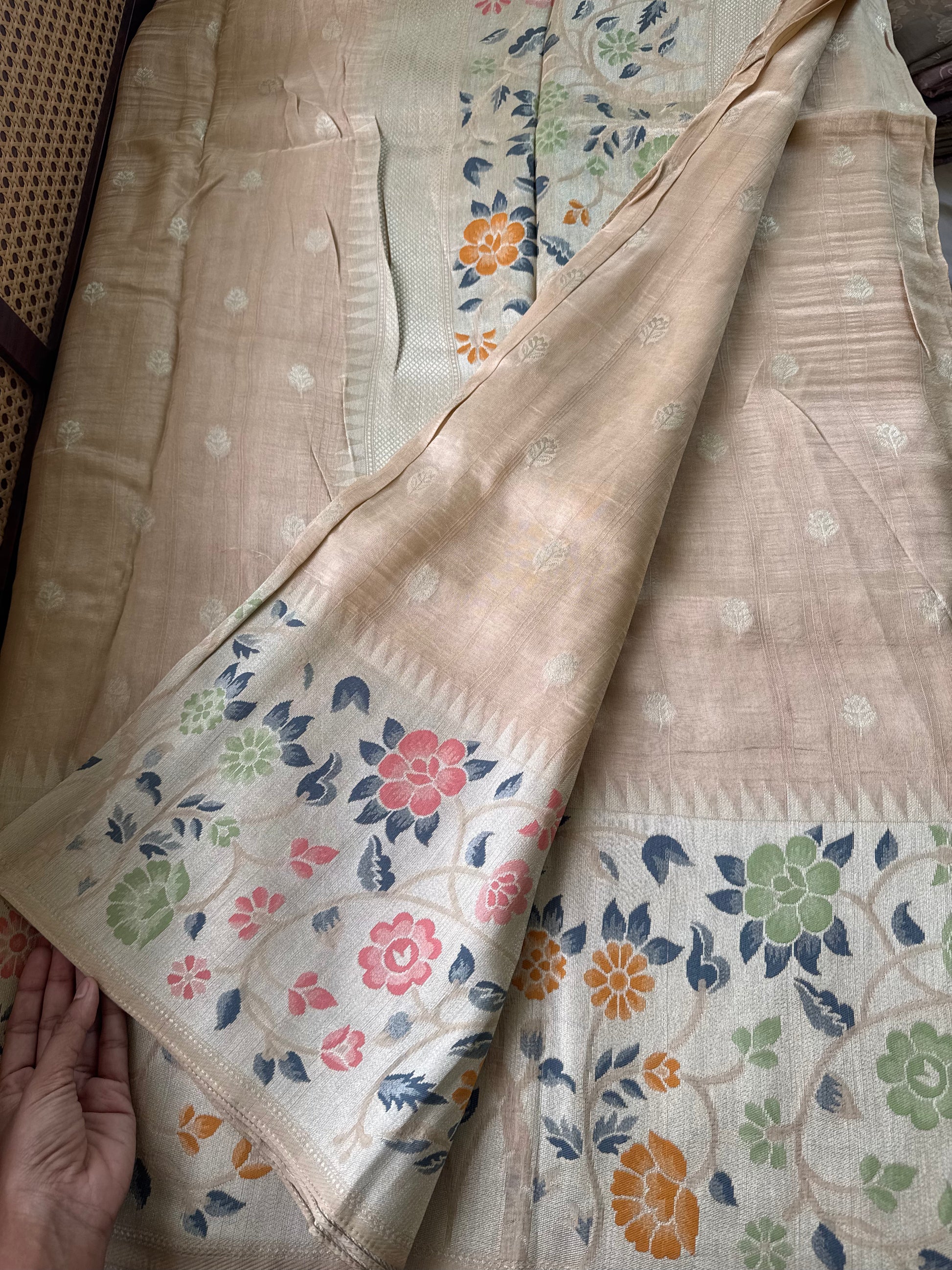 • Crafted from premium soft tussar georgette semi silk with meenakari border